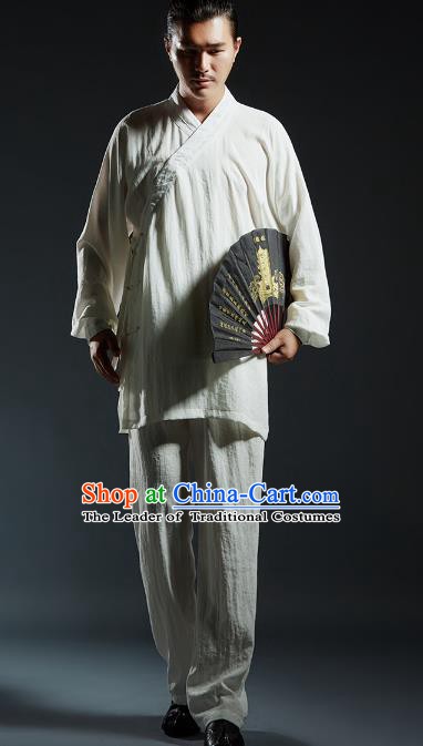 Traditional Chinese Kung Fu Costume Martial Arts Linen Plated Buttons Khaki Suits Pulian Meditation Clothing, China Tang Suit Uniforms Tai Chi Clothing for Men