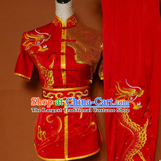 Top Kung Fu Group Competition Costume Martial Arts Wushu Embroidered Dragon Red Uniform for Men