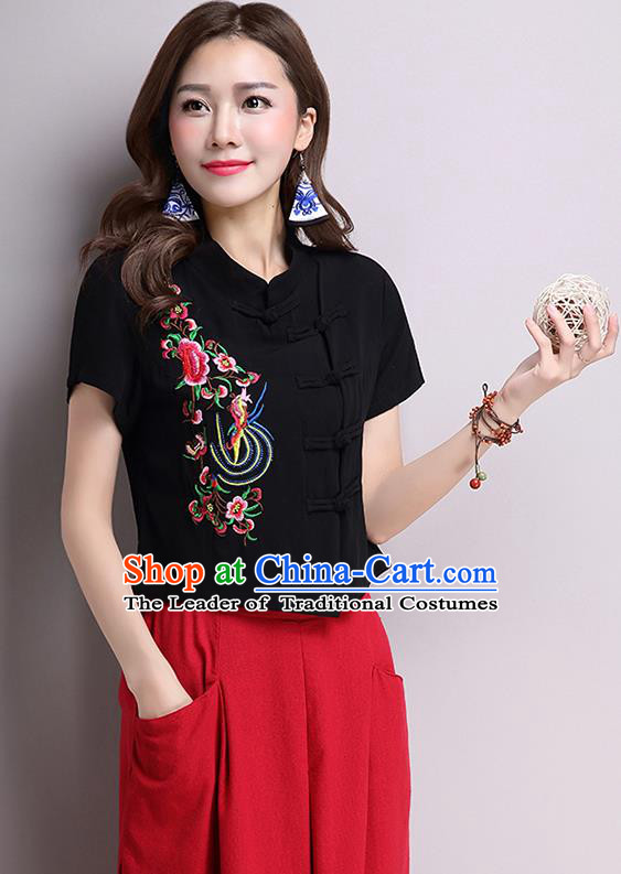 5618. Traditional Chinese National Costume, Elegant Hanfu Embroidery Flowers Birds Black T-Shirt, China Tang Suit Republic of China Plated Buttons Blouse Cheongsam Upper Outer Garment Qipao Shirts Clothing for Women