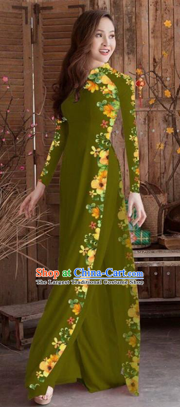560. Asian Vietnam Traditional Printing Cheongsam Vietnamese Olive Green Ao Dai Qipao Dress for Women