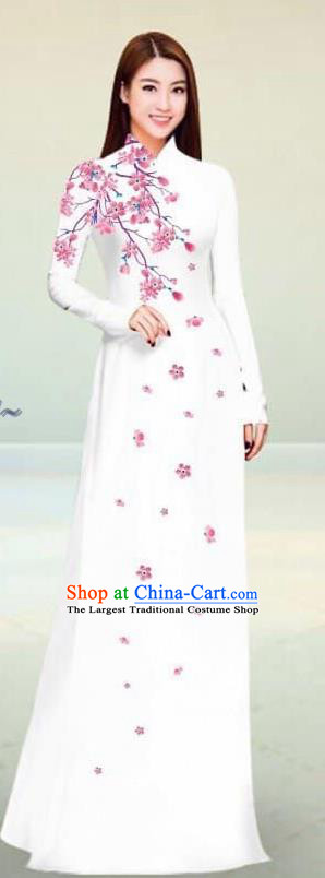 Asian Vietnam Traditional Printing Camellia White Dress Vietnamese National Classical Ao Dai Cheongsam for Women