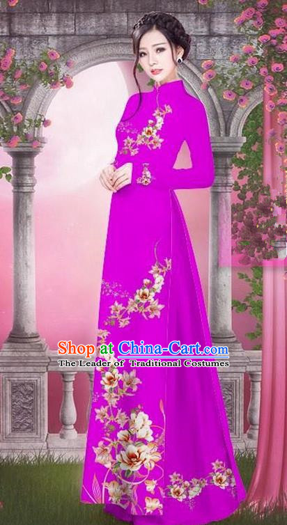Traditional Top Grade Asian Vietnamese Costumes Dance Dress and Loose Pants, Vietnam National Women Ao Dai Dress Printing Long Purple Cheongsam Clothing Complete Set