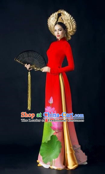 Traditional Top Grade Asian Vietnamese Costumes Dance Dress, Vietnam National Women Ao Dai Dress Printing Lotus Red Cheongsam Clothing