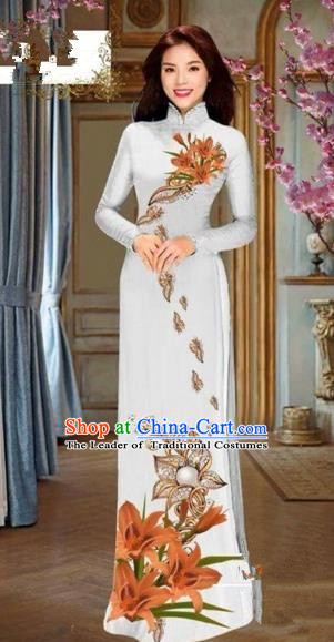 Traditional Top Grade Asian Vietnamese Costumes Classical Handmade Printing Full Dress and Pants, Vietnam National Ao Dai Dress Etiquette Qipao for Women