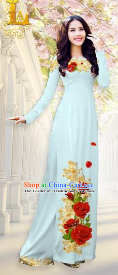 Traditional Top Grade Asian Vietnamese Costumes Dance Dress and Loose Pants, Vietnam National Women Ao Dai Dress Printing Long Rose Cheongsam Clothing Complete Set