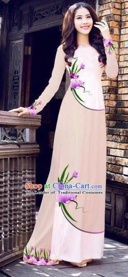 1766. Traditional Top Grade Asian Vietnamese Costumes Handmade Printing Pink Full Dress, Vietnam National Ao Dai Dress Qipao for Women