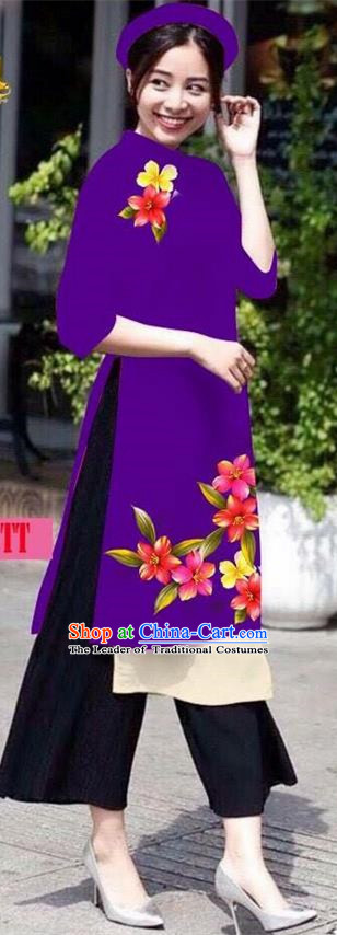 Top Grade Asian Vietnamese Traditional Dress, Vietnam National Dowager Ao Dai Dress, Vietnam Purple Cheongsam Dress and Pants for Woman