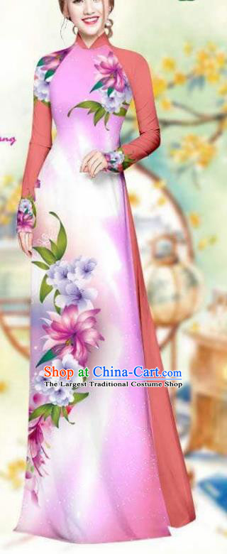 Vietnam Traditional Court Costume Printing Rosy Ao Dai Dress Asian Vietnamese Cheongsam for Women