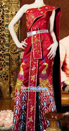 925. Traditional Thailand Customs Formal Peacock Clothing and Headwear Complete Set for Women