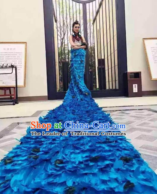 Brazilian Rio Carnival Samba Dance Costumes Catwalks Blue Feather Peacock Trailing Dress for Women