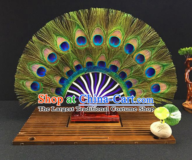 Chinese Handmade Bamboo Fan Classical Navy Blue Silk Accordion Fans Printing Peacock Feather Folding Fan