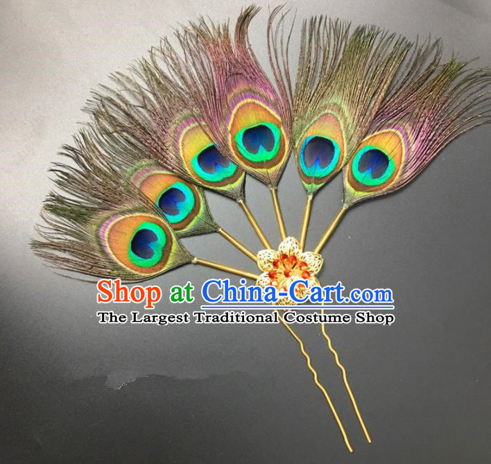 China Peacock Dance Hair Accessories Dai Nationality Dance Blue Feather Headpiece Woman Stage Performance Hair Stick