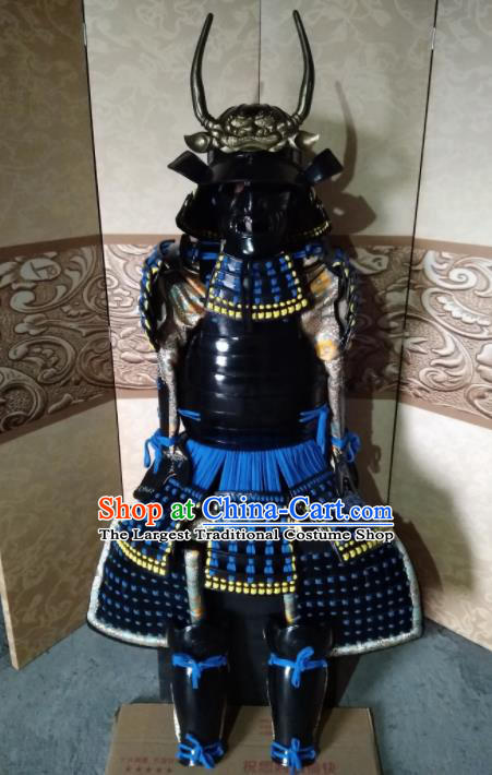 Japanese Handmade Traditional Samurai Blue Tassel Body Armor and Helmet Ancient Warrior Costumes for Men