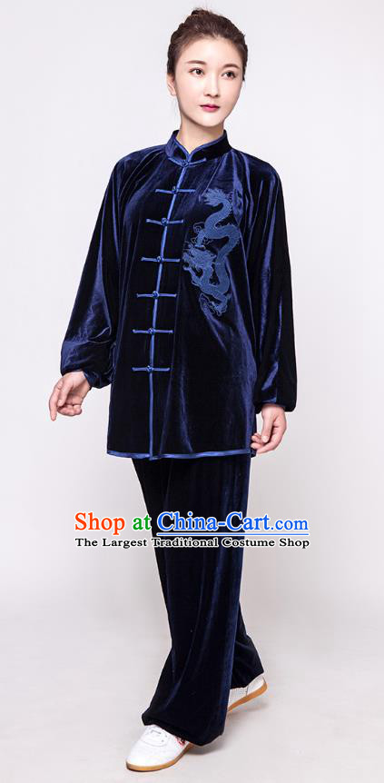 China Embroidered Dragon Tai Chi Training Costumes Martial Arts Clothing Traditional Kung Fu Navy Velvet Uniforms