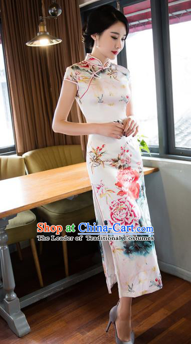 Traditional Chinese National Costume Printing Peony White Cheongsam Dress for Women
